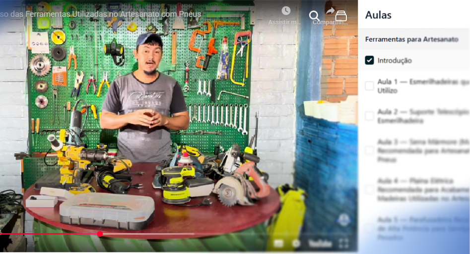 Eliabe é artesão há mais de 20 anos. Reconhecido por transformar pneus reciclados em esculturas impressionantes, ele decidiu compartilhar sua experiência em uma série de cursos completos. Neste primeiro módulo, você aprenderá a base que sustenta todas as criações: as ferramentas.
